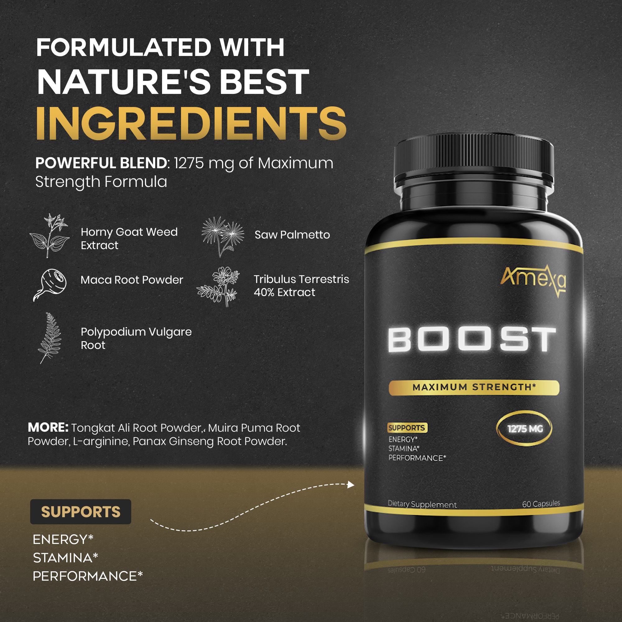 AmeXa Boost is engineered for who demand real results. This ultra-potent 1275mg formula combines 9 legendary herbal extracts to support energy, stamina, drive, and overall vitality.
